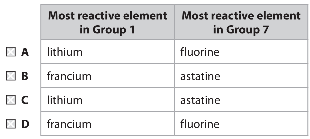 • C is not correct because lithium is not the most reactive element in Group 1 and astatine is not the most reactive element in Group 7.