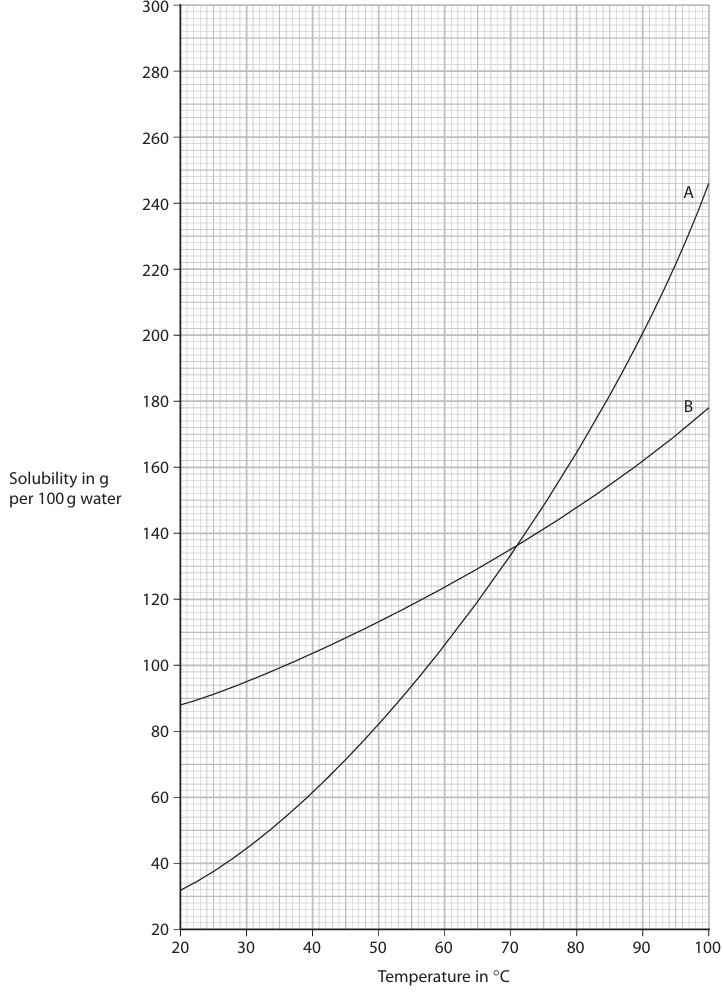 (iii) Suggest why the values for the solubility of A and B may be less accurate at 95 °C than at lower temperatures.