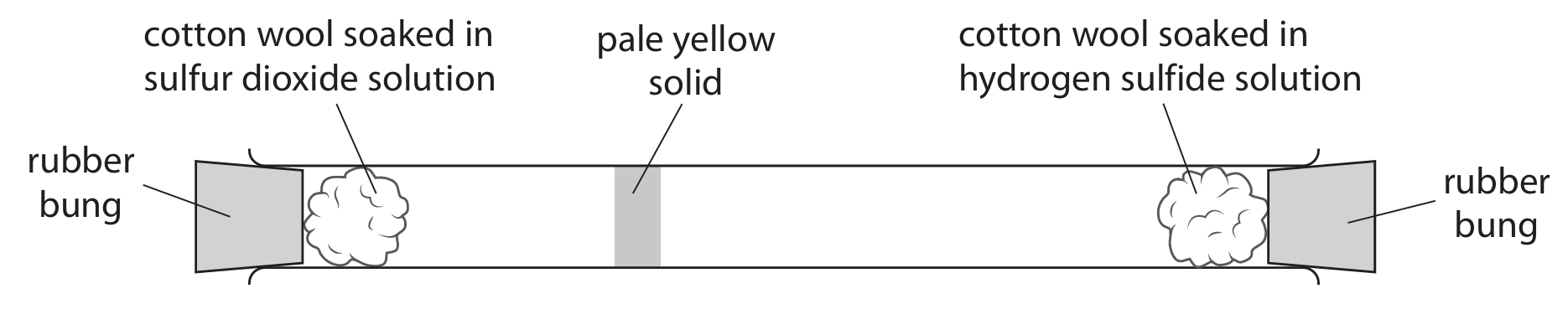 (b)(i) The pale yellow solid (sulfur) forms closer to the sulfur dioxide side / left side. This shows that hydrogen sulfide particles diffused further in the same time, meaning they move faster.