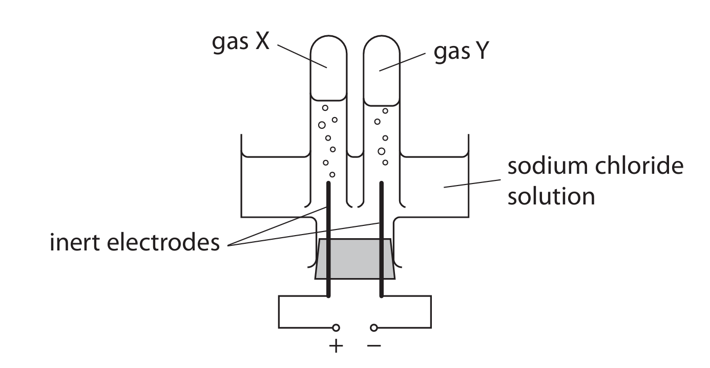 (e) The diagram shows the apparatus a teacher uses to demonstrate the electrolysis of a concentrated aqueous solution of sodium chloride.