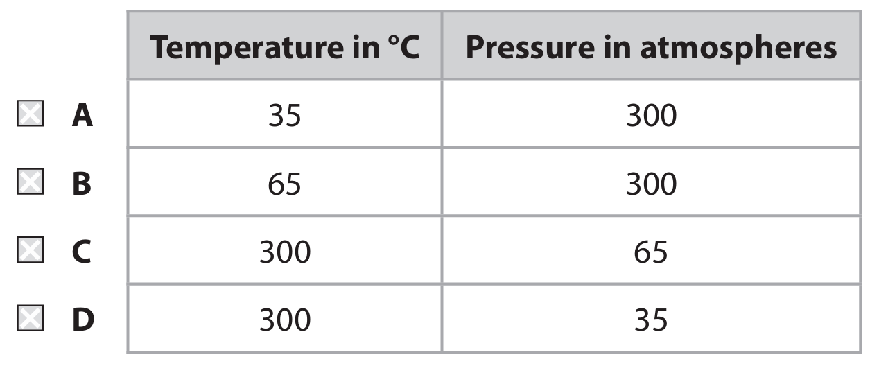 Which row gives the correct conditions of temperature and pressure for this reaction?