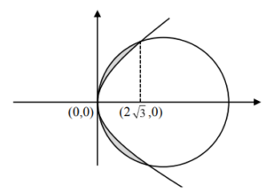\( A = 2 \int_{0}^{2/\sqrt{3}} \left( \sqrt{12 – (x – 2)^2} – \sqrt{2\sqrt{3} x} \right) \, dx \)