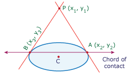 For ellipse \( \dfrac{x^2}{a^2}+\dfrac{y^2}{b^2}=1, \) the chord of contact from point \( (x_1,y_1) \) is found by writing the tangent in point form and replacing:![]()