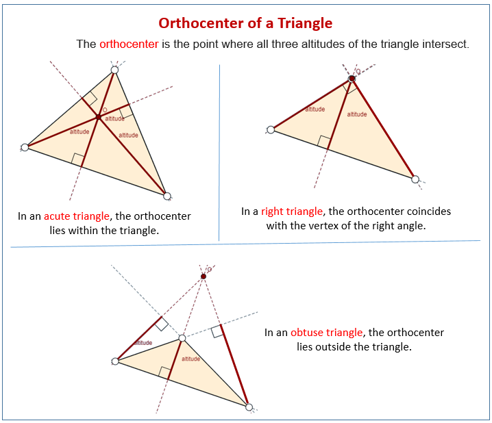 - Right triangle: Circumcenter = midpoint of hypotenuse, Orthocenter = right angled vertex.