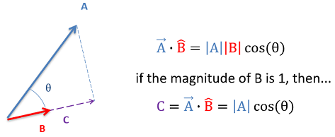 \( \vec{a} \cdot \vec{b} = |\vec{a}|\,|\vec{b}| \cos\theta \)