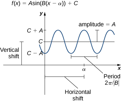 - B controls period Period = \( \dfrac{2\pi}{|B|} \)