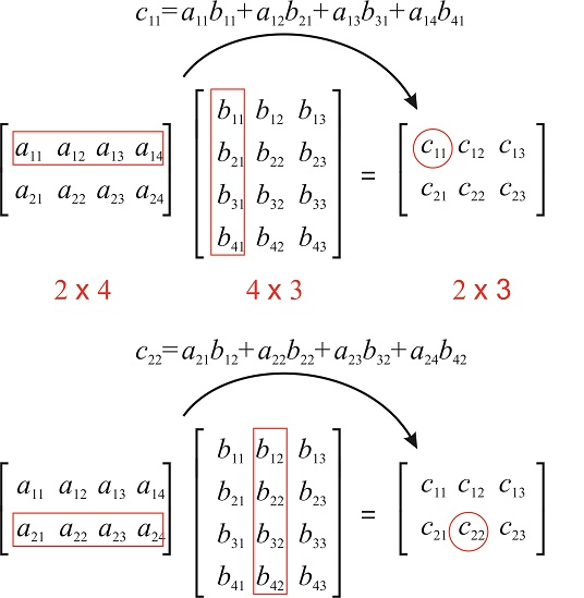 \( (AB)_{ij} = \sum_{k=1}^{n} a_{ik}b_{kj} \)
