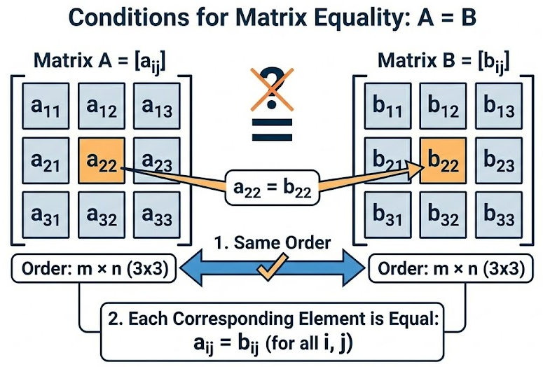 - Each corresponding element is equal: \( a_{ij} = b_{ij} \).