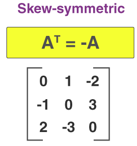- Skew-Symmetric Matrix: \( A^T = -A \)