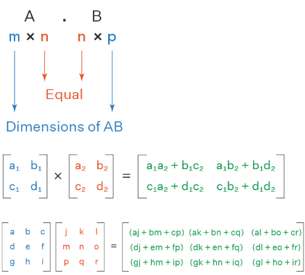 Condition for Multiplication: The number of columns of the first matrix (A) must be equal to the number of rows of the second matrix (B).