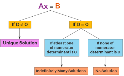 - If \( |A| = 0 \), the system may be consistent (infinite solutions) or inconsistent (no solution) depending on \( \text{adj}(A)B = 0 \) or not.