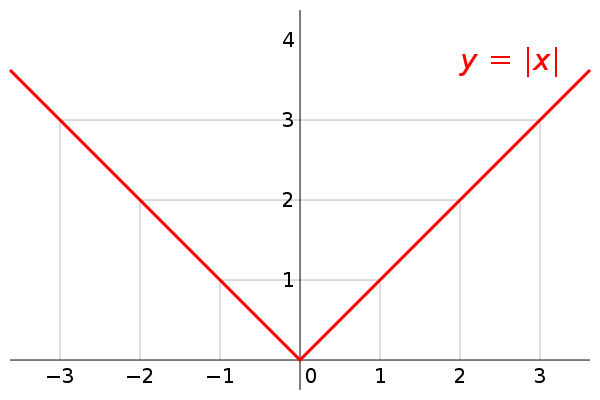 Defined as $ f(x) = |x| = \begin{cases} x, & x \ge 0 \\ -x, & x < 0 \end{cases} $