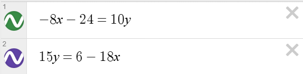 \[ \begin{aligned} & -8x – 24 = 10y \\ & 15y = 6 – 18x \end{aligned} \]
