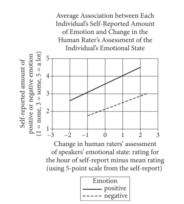 According to figure above , when the change in human raters’ assessment of speakers’ emotional state was 1 , the average self-reported amount of positive emotion was approximately