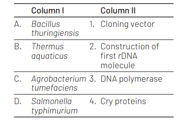 The correct option is (a). It can be explained as follows Bacillus thuringiensis is a source of Cry proteins. Thermus aquaticus is a source of thermostable DNA polymerase (Taq polymerase) used in PCR. Agrobacterium tumefaciens is a cloning vector. The construction of 1st recombinant DNA molecule was performed using native plasmid of Salmonella typhimurium.