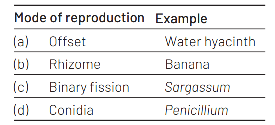 The correctly matched pair is onion-bulb. Onion is a simple tunicated layered bulb while ginger is a straggling rhizome having uniparous cyme branching with sympodial axis. While yeast reproduces by budding and Chlamydomonas by zoospores.