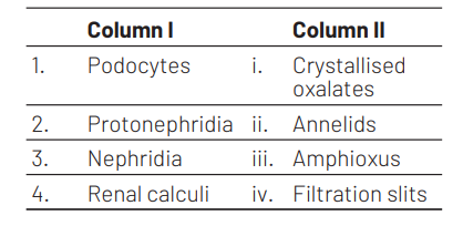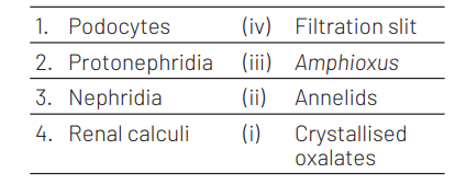 Podocytes are cells in Bowman’s capsule in kidneys. They have filtration slits through which the blood is filtered. Protonephridia help in osmoregulation. Nephridia in annelids help in osmoregulation and excretion. Renal calculi are kidney stones which mainly consist of crystallised oxalates.