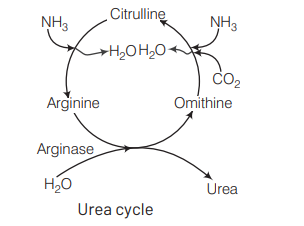 Ornithine combines with one molecule of $\mathrm{NH}_3$ and $\mathrm{CO}_2$ to produce citrulline. Citrulline combines with another molecule of $\mathrm{NH}_3$ to form arginine. Arginine is broken down into urea and ornithine which repeats the cycle. This is called Ornithine cycle or urea cycle or Krebs-Henseleit cycle.
