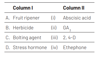 Options (c) is the correct match which is as follows The function of different phytohormones include ethephon is a commercial derivative of ethylene and it is used to ripen fruits. $2,4-D$ is a synthetic auxin and it is used as herbicide against dicotyledonous weeds. Gibberellic acid induces bolting in plants, i.e. the promotion of internodal elongation just prior to their reproductive phase.