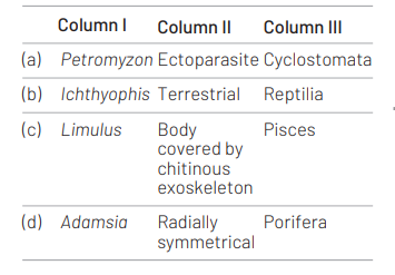 Match the name of the animal (column I) with one characteristics (column II) and the phylum/class (column III) to which it belongs [NEET 2013]