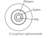 In the ectophloic siphonostele, the xylem surrounds pith and this xylem is surrounded by phloem, pericycle and endodermis respectively. e.g. Osmunda and Equisetum.