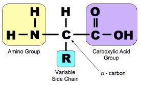 - They all contain an amine (NH2) group, a carboxyl (-COOH) group which combine to form the peptide bond and a “R” group