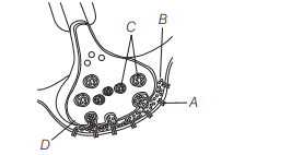 A-Receptor, B-Synaptic cleft, C-Synaptic vesicles, $\mathrm{D}-\mathrm{Ca}^{2+}$.