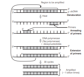 The Polymerase Chain Reaction (PCR] involves three basic steps; denaturation, annealing and extension. In the denaturation step. DNA is heated at high temperature $\left[94^{\circ} \mathrm{C}\right.$ to $96^{\circ} \mathrm{Cl}$ to separate the two strands. In the next step lannealingl the two oligo-nucleotide primers anneal to each single-stranded template DNA.