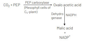 The fixation of $\mathrm{CO}_2$ in $\mathrm{C}_4$-plants takes place in two places and by two ditferent arganic compounds. Phosphoenol Pyruvate [PEP) is tound in mesophyl cells which primarily tixes atmospheric $\mathrm{CD}_2$ into pxalo acetic acid (4EL