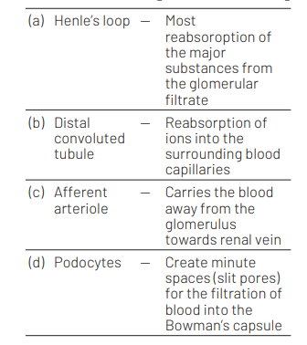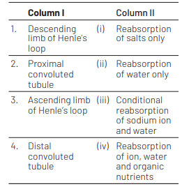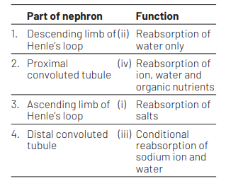 Match the following parts of a nephron with their function. [NEET (Odisha) 2019