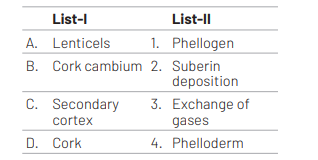Cork cambium is a meristematic tissue involved in secondary growth. It is also called phellogen. It is few layer thick and it cut off cells into an outer layer and an inner layer. The former differentiates into cork or phellem while the latter differentiate into secondary cortex or phelloderm. The phellogen, phellem and phelloderm are collectively known as periderm. In woody trees, phellogen cuts off closely arranged parenchymatous cells which ruptures the epidermis and form lenticels. Thus, statement 1 is incorrect while other are correct.
