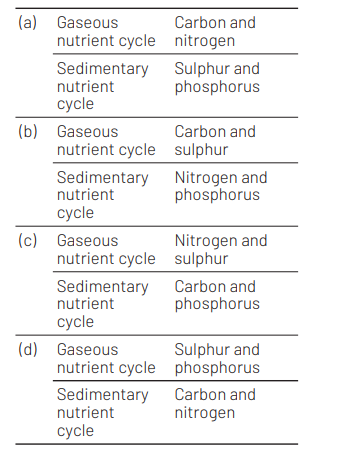 The biogeochemical cycles are of two types, i.e. gaseous cycles, in which the reservoir for the nutrient elements is in the atmosphere (air) or hydrosphere (water). The four most abundant elements in the living systems, i.e. hydrogen, carbon, oxygen and nitrogen have predominantly gaseous cycles. In sedimentary cycles, the reservoir for the nutrient elements is in the sediments of the earth. Elements, such as phosphorus, sulphur, potassium and calcium have sedimentary cycles.