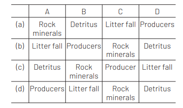 Given below is a simplified model of phosphorus cycling in a terrestrial ecosystem with four blanks (A-D). Identify the blanks [CBSE AIPMT 2014]