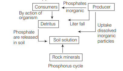 Staement (c) is incorrect and can be corrected as Phosphorus cycle is a type of sedimentary cycle, i.e. it main reservoirs are soil and rocks. It is mainly found as phosphates in rocks. During this cycle phosphorus solublising bacteria like Pseudomonas, Acetobacter, etc., help to release phosphorus from organic remains. A large amount of phosphate is lost in sea by sedimentation. There is no respiratory release of phosphorus into atmosphere because phosphorus is an inorganic nutrient that does not take part in respiration.
