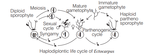 Ectocarpus and Fucus respectively show haplodiplontic and diplontic life cycle.
