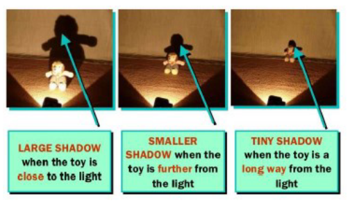 Shadows change depending on how close the light source is to the object. If the object is close to the light source you will get a big shadow. If the object is far away from the light source you will get a small shadow.